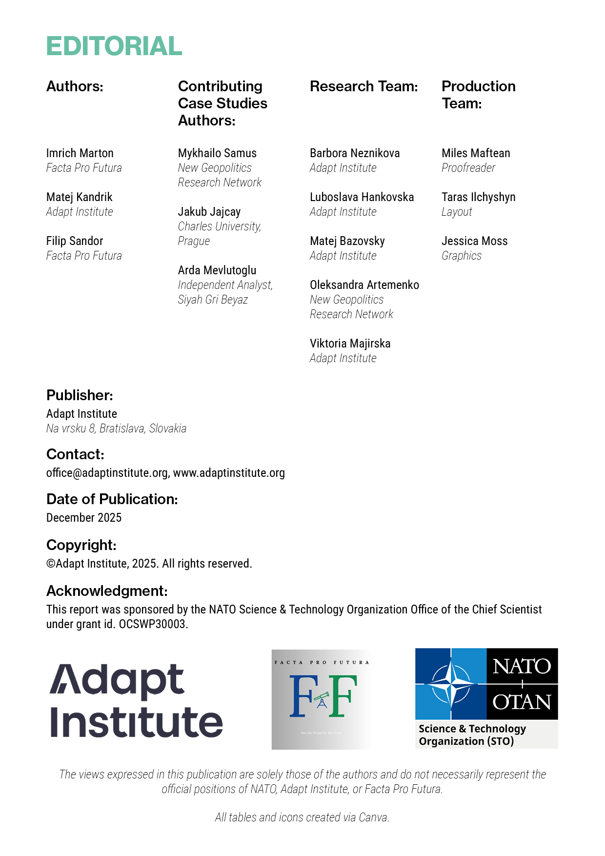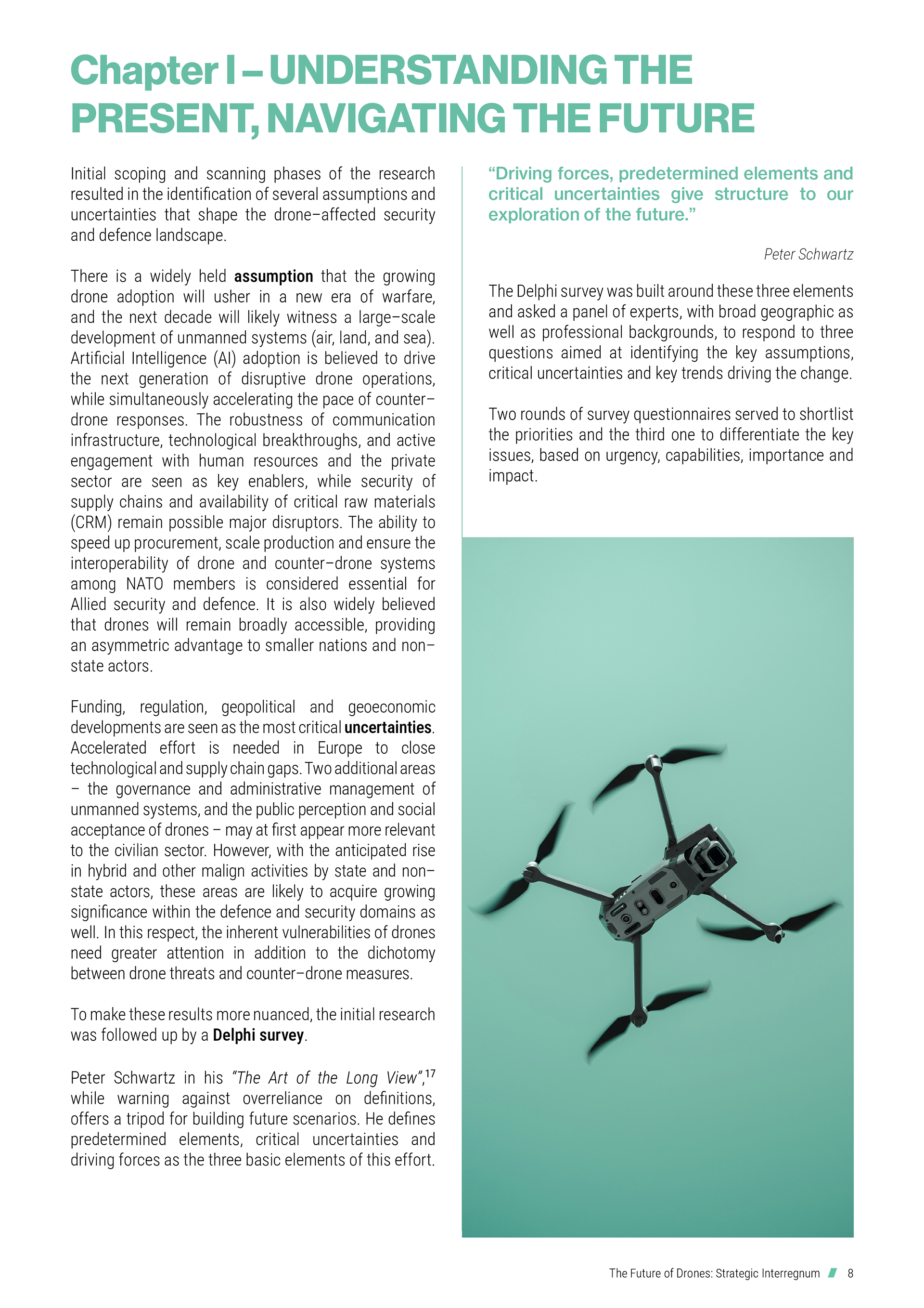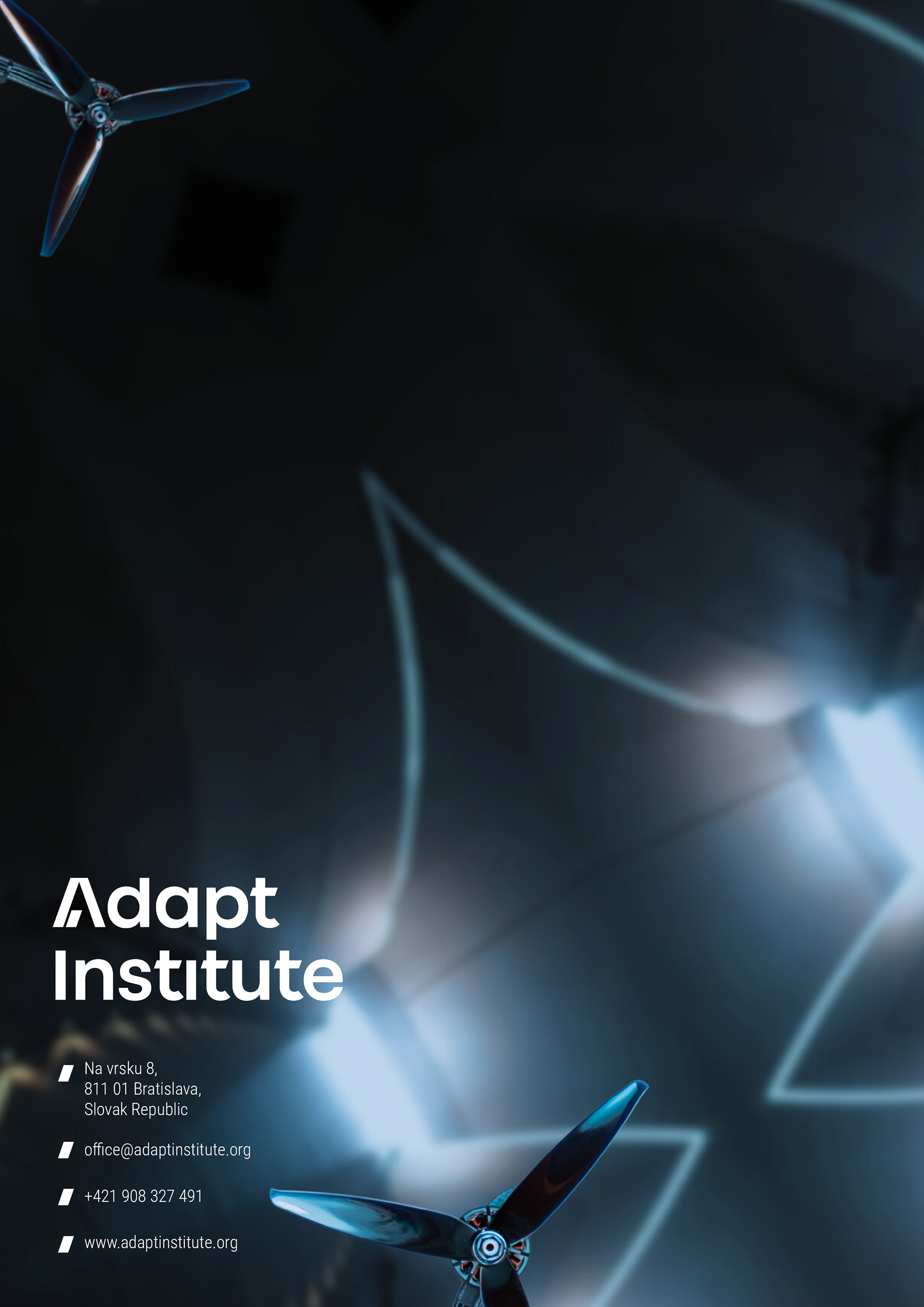 For this strategic foresight report on the future of drones and security produced by Slovakian think tank Adapt Institute, Ilchyshyn Studio was responsible for the complete layout and visual design of the publication. Our scope included establishing the document structure and hierarchy, designing the cover and back pages, and ensuring consistency with the organisation’s visual identity.